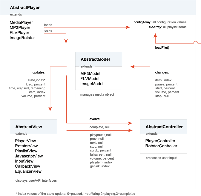 The fileArray and configArray variables are used by each member of the MCV cycle for setup. Another file can be loaded through the loadFile() function, which is available both in actionscript and javascript.